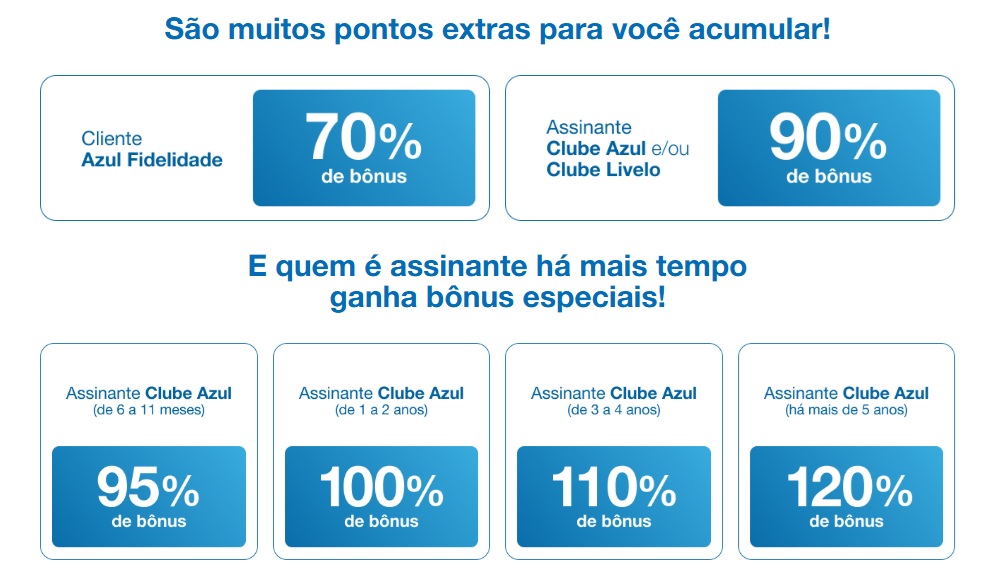 2. Para garantir o bônus, o cliente deve possuir cadastro no programa de fidelidade da Azul, com a conta em situação regular.
