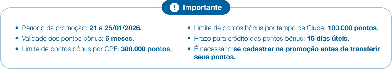 Após se cadastrar, transfira seus pontos até 25/01/2026.