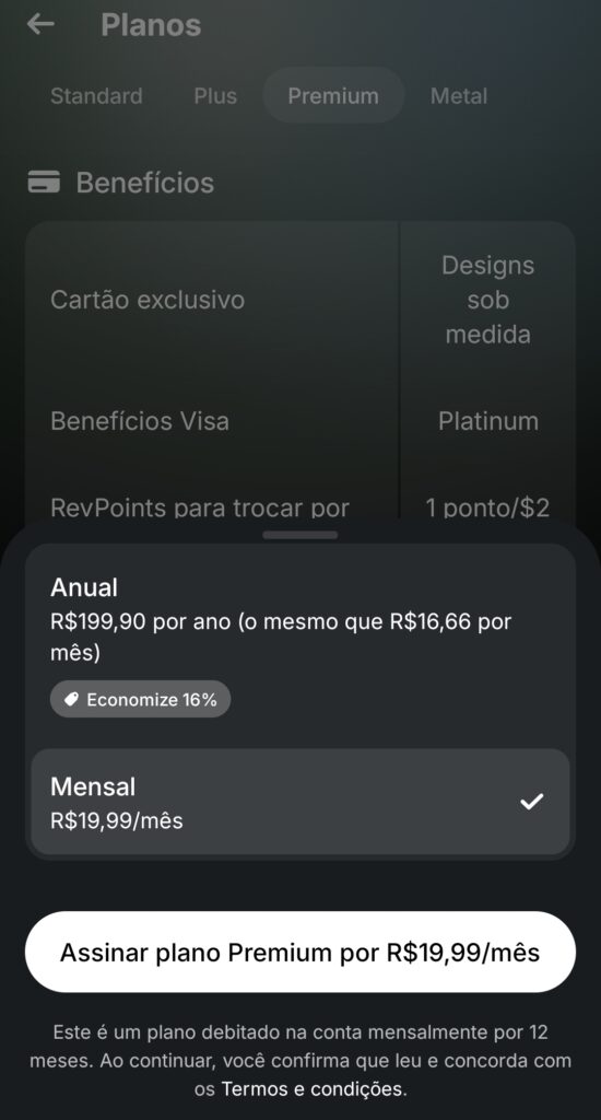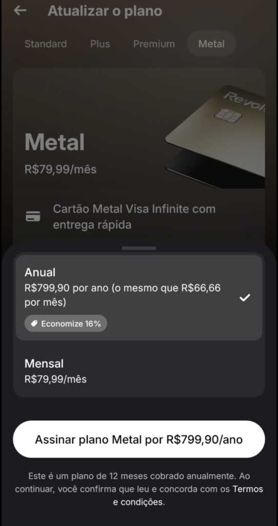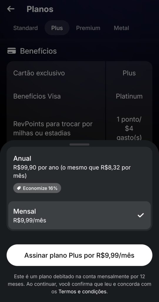 - Deixe o Plano Metal apenas se você faz questão do cartão de metal ou se os pontos RevPoints em compras internacionais for alto o suficiente para cobrir a diferença da anuidade. Ainda assim o plano metal você ganha muitos benefícios como até sala vip grátis nos aeroportos com Dragon Pass e Fast Pass Visa Infinite.