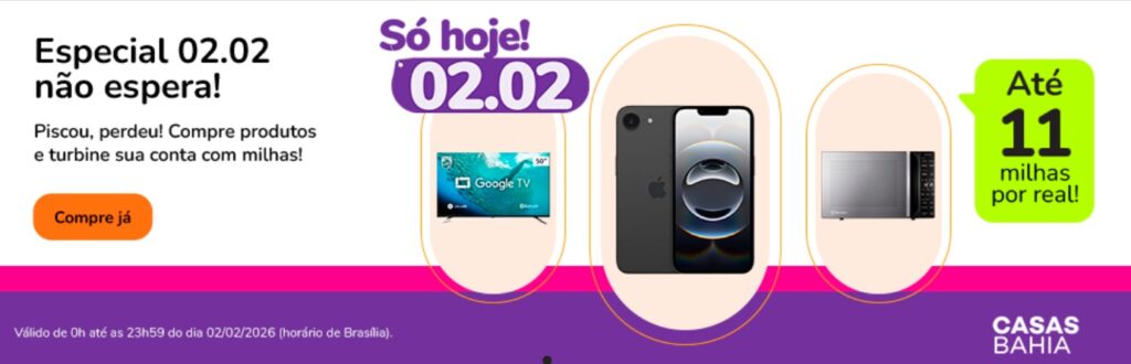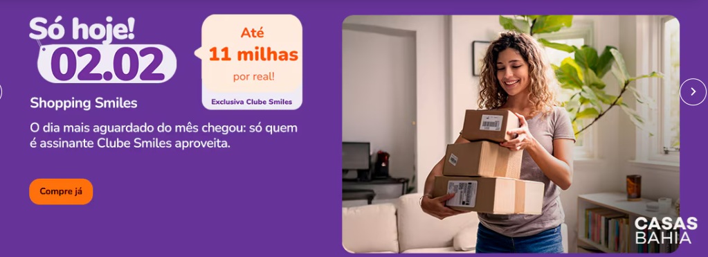 Só Hoje 02/02! Compre no site Shopping Smiles junto a Casas Bahia e ganhe até 11 milhas por R$ 1