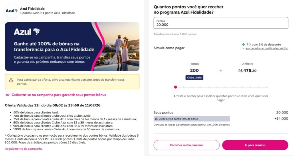 - 70% de bônus para clientes Clube Azul e/ou Clube Livelo;