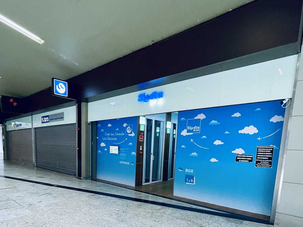 Localizado dentro do terminal de passageiros (LMG-800, KM 7,9), o Siesta Box oferece cabines individuais de descanso, compactas e tecnológicas, equipadas com: