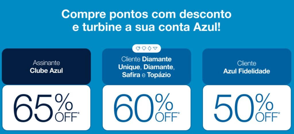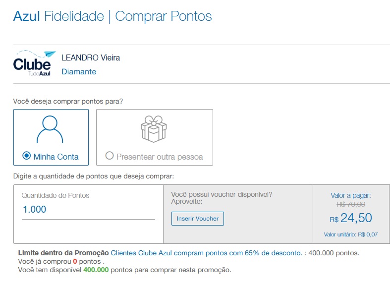 1. Elegibilidade 1.1. Clientes cadastrados no programa Azul Fidelidade poderão adquirir de 1.000 (um mil) até 100.000 (cem mil) pontos Azul dentro de um período de 12 (doze) meses.