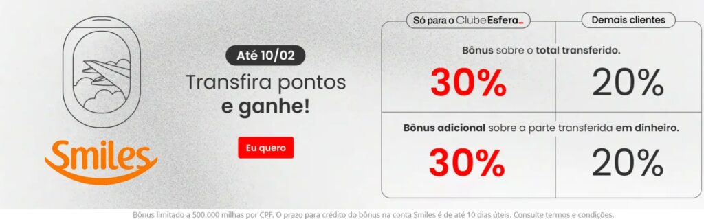 Valor mínimo para a transferência somente com pontos: 30.000 pontos Esfera;