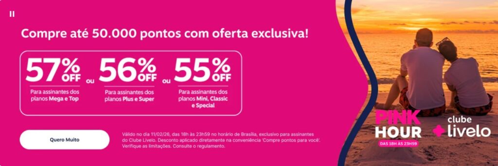 Esta quarta-feira, 11 de fevereiro de 2026, é o dia da “Pink Hour” na Livelo, e o Leandro Vieira acaba de alertar: a janela para fabricar o milheiro no menor custo do ano fecha às 23h59.
