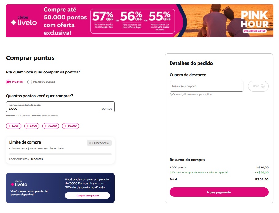 - Limite de Compra: Restrito a 50.000 pontos por CPF (dentro do período de 30 dias).