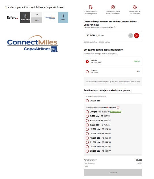 – Fator de Conversão: 3 Pontos Esfera = 1 Milha ConnectMiles