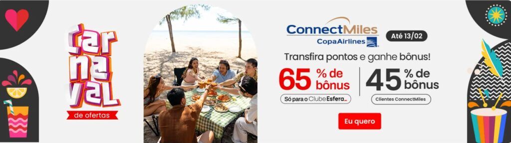 – Clientes ConnectMiles com Clube Esfera recebem 65% de Bônus.