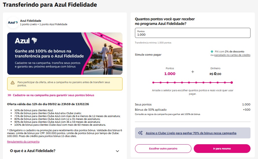 • 70% de bônus para clientes Clube Azul e/ou Clube Livelo;