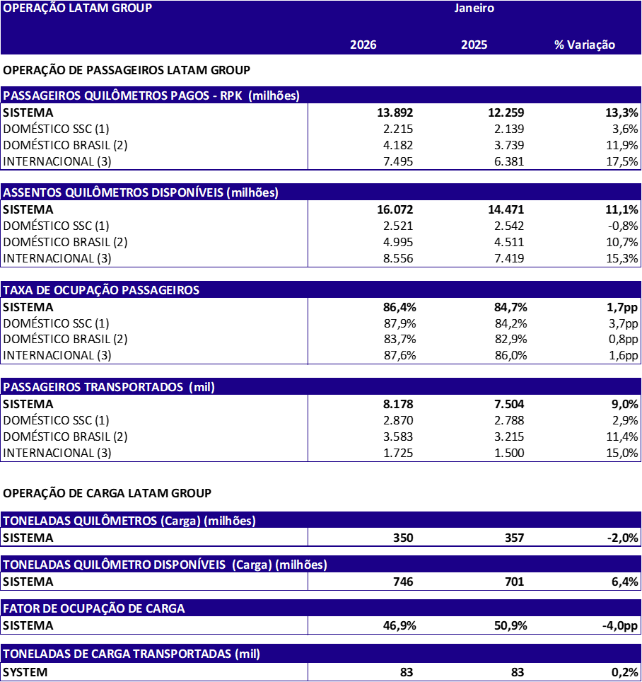 No consolidado, os números da LATAM Brasil ajudaram a impulsionar em 9% o tráfego de passageiros do Grupo LATAM, em comparação a janeiro de 2025. O grupo transportou 8,2 milhões de passageiros em janeiro, com fator de ocupação de 86,4% (+1,7 p.p.). A capacidade consolidada (ASK) do grupo aumentou 11,1%, enquanto o tráfego consolidado (RPK) cresceu 13,3% na mesma base de comparação.