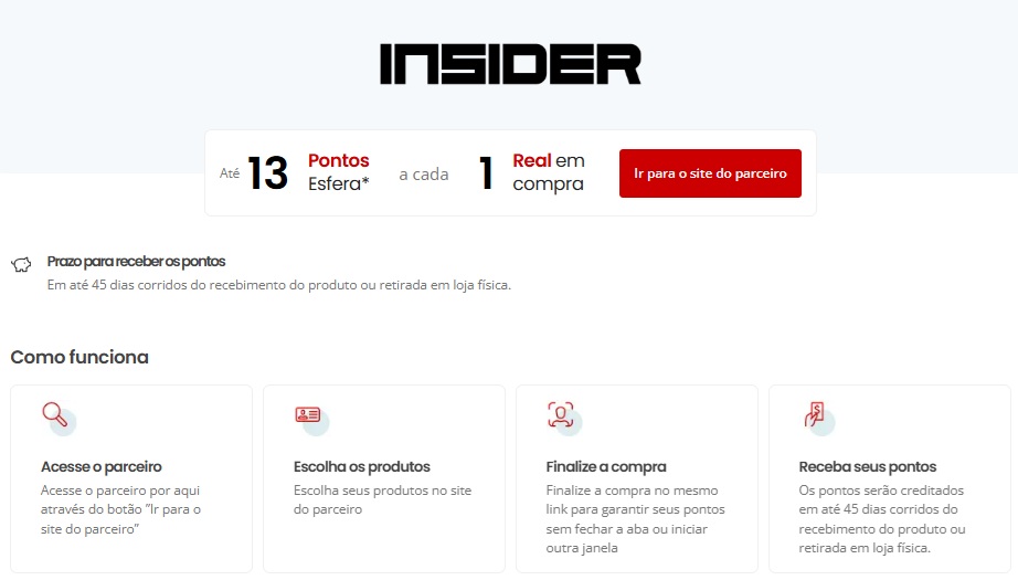 - Para juntar pontos, acesse o hotsite através do botão “Ver Cupom” e depois “Ir para o site do parceiro”, insira o cupom ESFERA, escolha seus produtos e utilize as opções de pagamentos disponíveis no site.