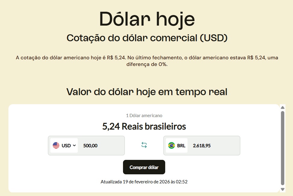 Nesta quinta-feira, 19 de fevereiro de 2026, o cenário para quem usa conta global está excelente. Após o período de volatilidade do Carnaval, a moeda americana está apresentando uma queda firme, abrindo espaço para aportes estratégicos.
