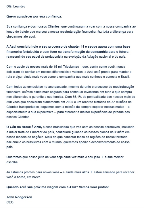 Essa nota do John Rodgerson marca um momento histórico para a aviação brasileira. Hoje, 21 de fevereiro de 2026, a notícia de que a Azul concluiu oficialmente sua reestruturação financeira e saiu do Chapter 11 (o processo de recuperação judicial nos EUA) está no topo das manchetes do setor.