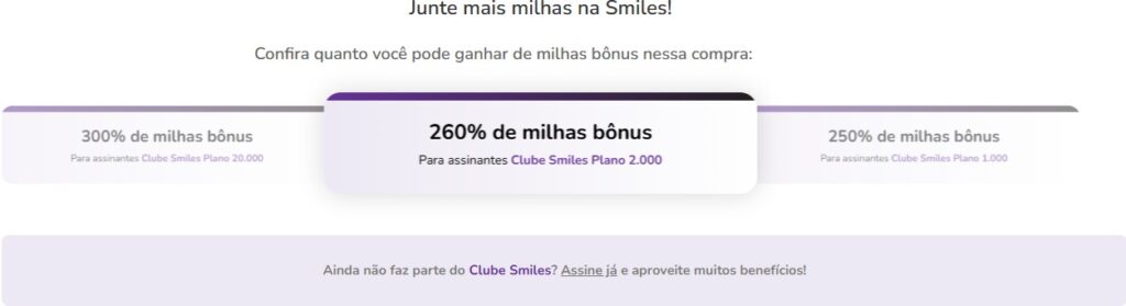 260% de milhas bônusPara assinantes Clube Smiles Plano 2.000 CMV = R$ 22,22