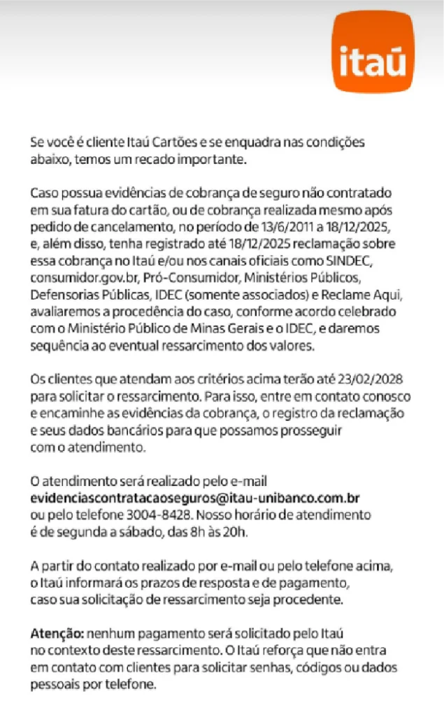 Caso possua evidências de cobrança de seguro não contratado em sua fatura do cartão, ou de cobrança realizada mesmo após pedido de cancelamento, no período de 13/6/2011 a 18/12/2025, e, além disso, tenha registrado até 18/12/2025 reclamação sobre essa cobrança no Itaú e/ou nos canais oficiais como SINDEC, consumidor.gov.br, Pró-Consumidor, Ministérios Públicos, Defensorias Públicas, IDEC (somente associados) e Reclame Aqui, avaliaremos a procedência do caso, conforme acordo celebrado com o Ministério Público de Minas Gerais e o IDEC, e daremos sequência ao eventual ressarcimento dos valores.