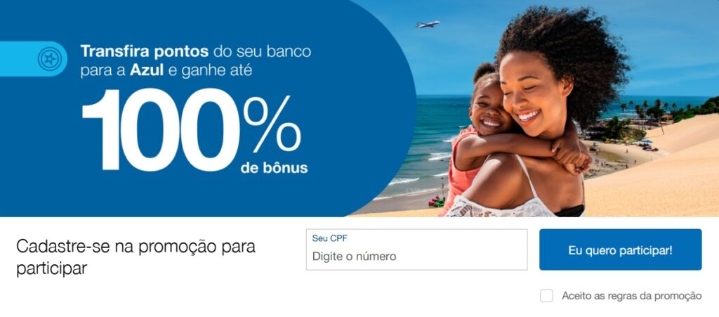 2.3 Para garantir o bônus, o cliente deve possuir cadastro no programa de fidelidade da Azul, com a conta em situação regular e também cadastrar seu CPF no link da promoção https://www.voeazul.com.br/br/pt/ofertas/bancos antes de realizar a transferência. Não participa da campanha: Livelo, Esfera e Porto.