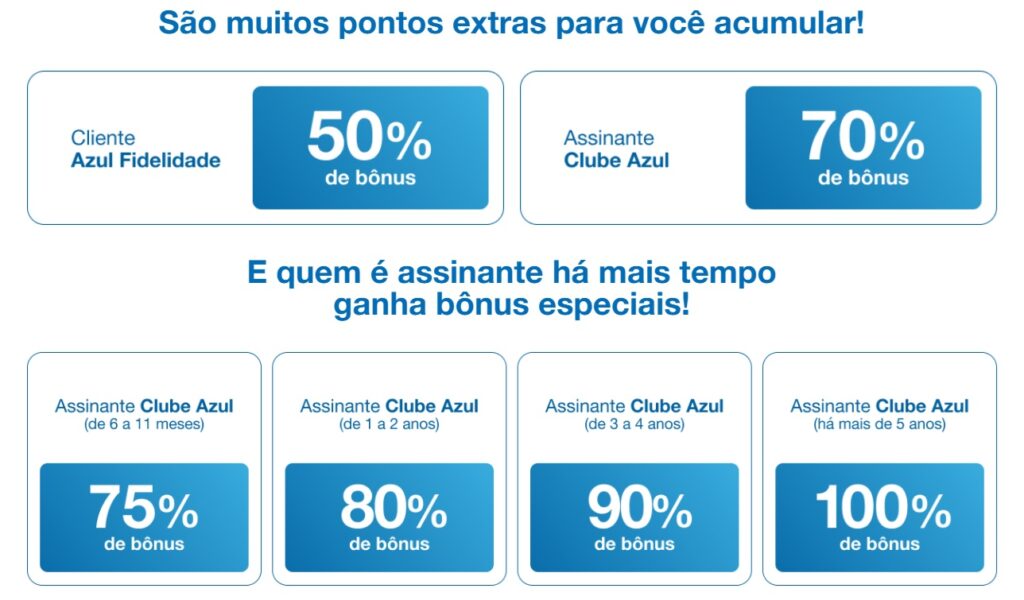 2. Para garantir o bônus, o cliente deve possuir cadastro no programa de fidelidade da Azul, com a conta em situação regular.