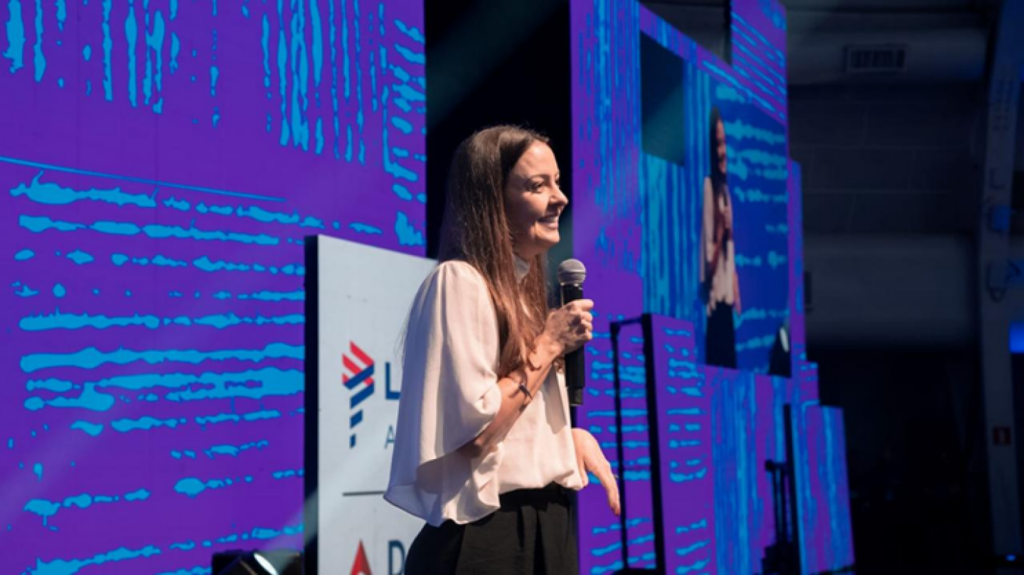 Aline Mafra, Diretora de Vendas e Marketing da LATAM Brasil, durante sua fala no LACTE (Divulgação LATAM)