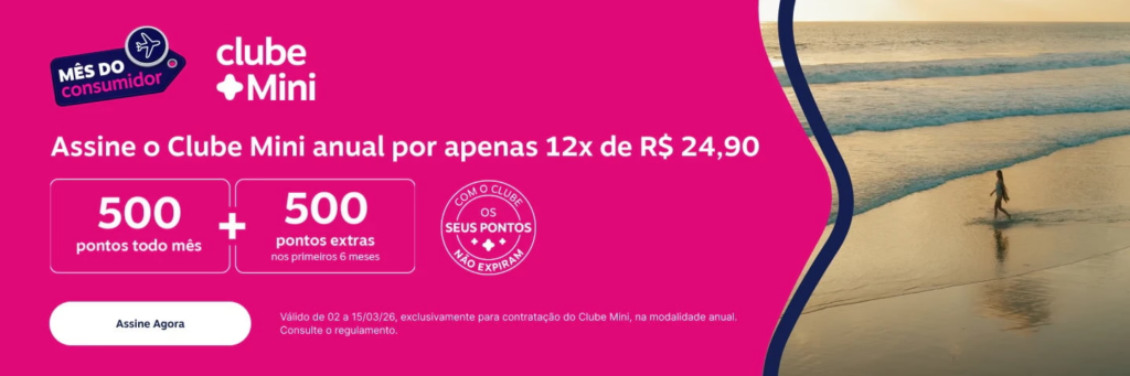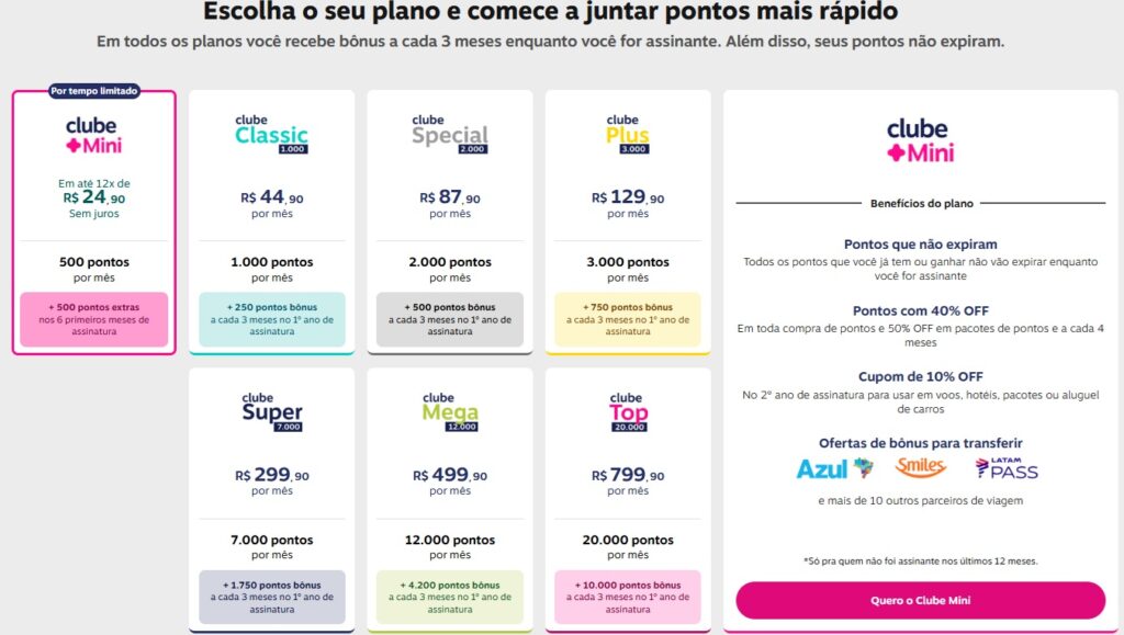 - O Clube Mini vale a pena? Sim, se o seu objetivo for apenas manter os pontos ativos (não expiram) e ter acesso às promoções de transferência bonificada gastando o mínimo possível (R$ 24,90/mês). É o plano ideal para quem não quer comprometer o orçamento.