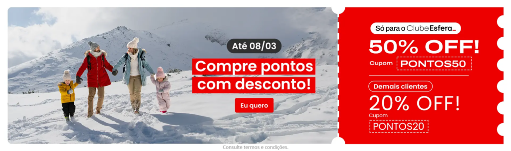 Além do desconto na compra, a Esfera reduziu o mínimo para transferência para a Smiles entre os dias 04 e 06 de março de 2026. O valor caiu de 30.000 para apenas 15.000 pontos. É a chance perfeita para quem quer “limpar” o saldo ou completar uma emissão.