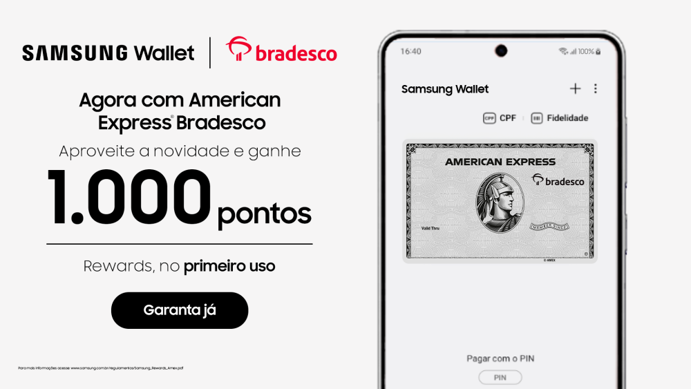 Para celebrar a novidade, usuários que cadastrarem um cartão American Express Bradesco na Samsung Wallet e realizarem um pagamento por aproximação dentro do período promocional receberão 1.000 pontos no Samsung Rewards.