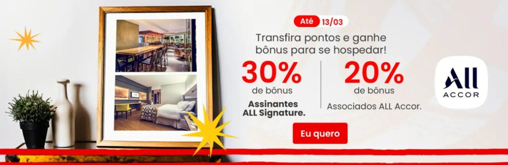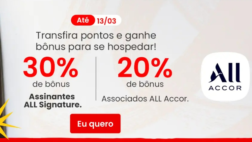 • 20% bônus associados ALL Accor e associados assinantes do plano ALL Signature receberão 10% (dez por cento) de bônus adicionais, creditados no momento da efetivação da transferência.