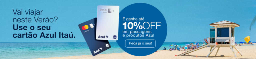 ✔ 10% de desconto na Azul Viagens: pacotes, hospedagens, ingressos, aluguel de carros, translados e passeios;