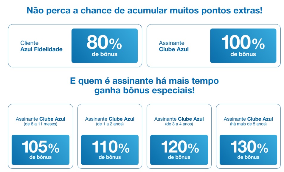 2. Para garantir o bônus, o cliente deve possuir cadastro no programa de fidelidade da Azul, com a conta em situação regular.