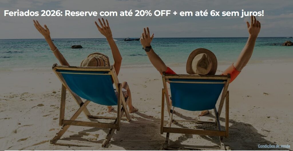 • As ofertas estão sujeitas a condições e à disponibilidade do hotel, além da disponibilidade da oferta no hotel escolhido. Você tem alguns momentos para validar as condições da tarifa: no momento de selecionar os hotéis, quartos e antes de finalizar a sua compra.