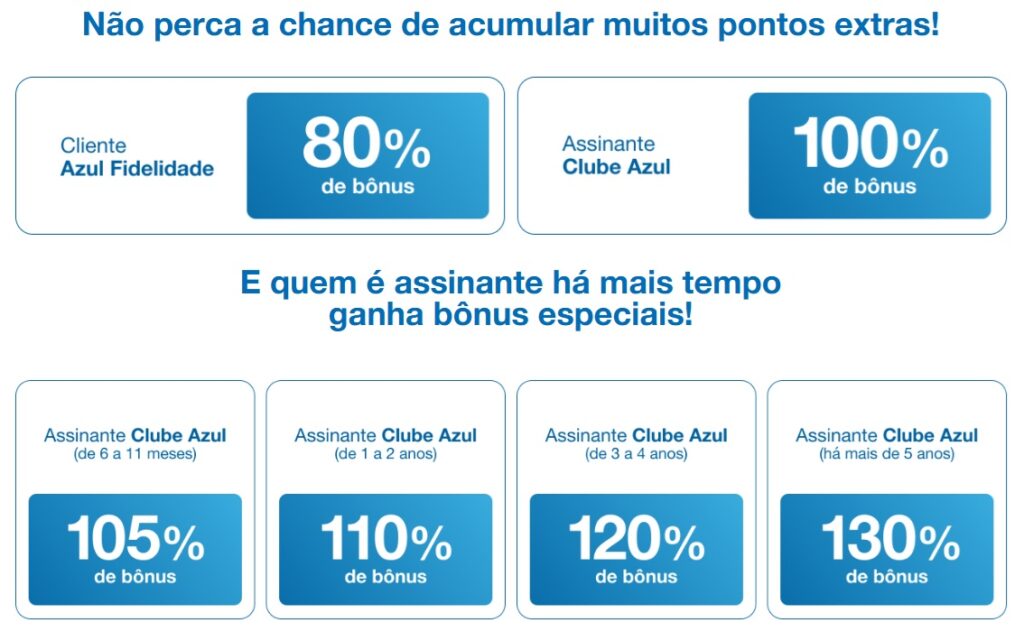 2. Para garantir o bônus, o cliente deve possuir cadastro no programa de fidelidade da Azul, com a conta em situação regular.