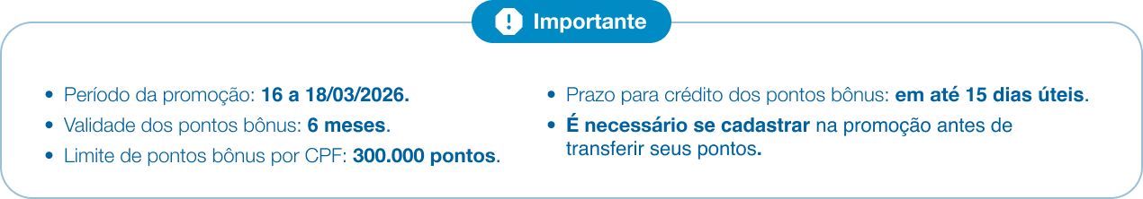 3.Clientes Azul: Bônus de 80% válido para clientes que transferirem pontos para o programa de fidelidade da Azul durante o período promocional. O limite máximo de pontos bônus a ser concedido por CPF é de 300.000 pontos.
