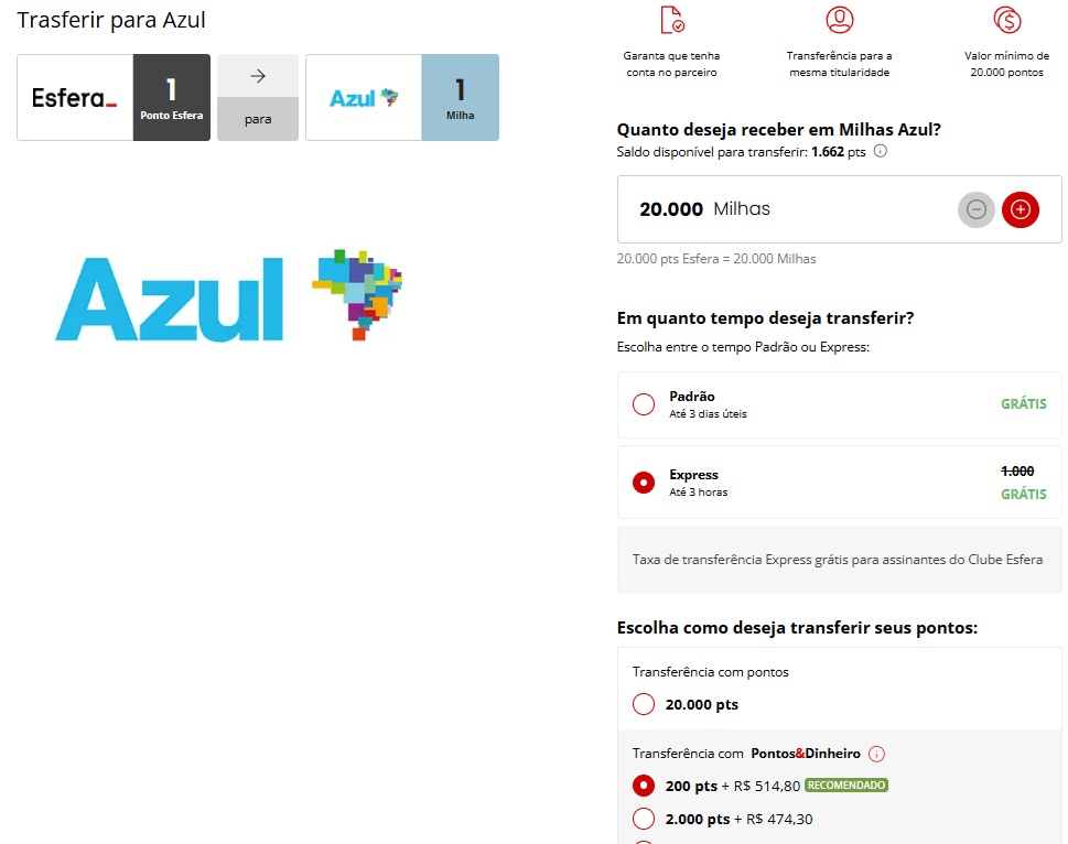 – As transferências entre Esfera e Azul são válidas apenas para contas de mesma titularidade. Recomendamos verificar seu cadastro antes da transferência.