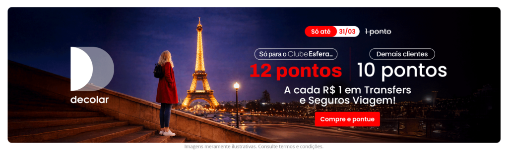 - Acúmulo Máximo: 12 pontos por R$ 1,00 em Transfers e Seguro Viagem para assinantes do Clube Esfera.