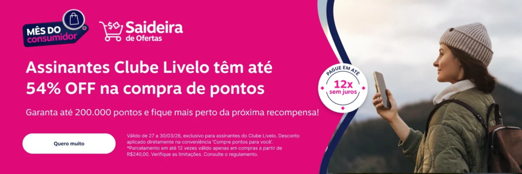 A promoção da Livelo, denominada “Saideira de Ofertas” do Mês do Consumidor, foca na geração de pontos com alto desconto para assinantes do Clube.