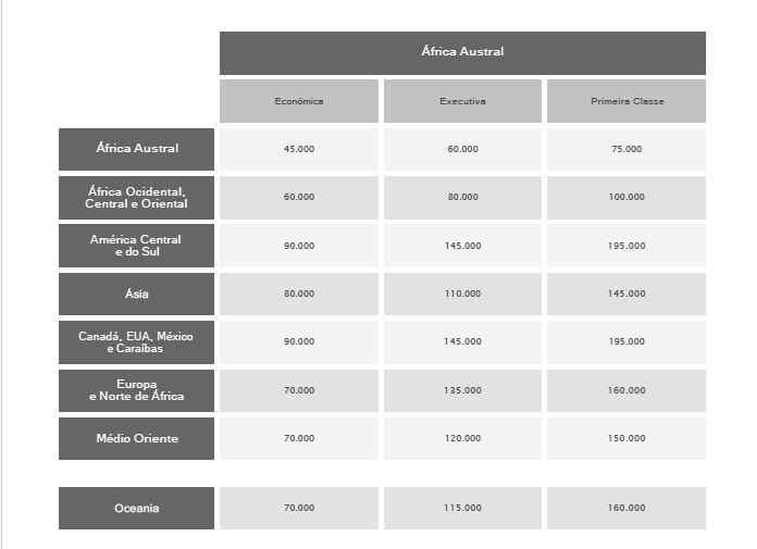 Brasil → África (Sul)60.000 milhas110.000 milhas