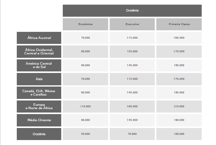 Brasil → Oriente Médio110.000 milhas180.000 milhas