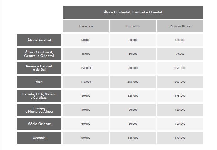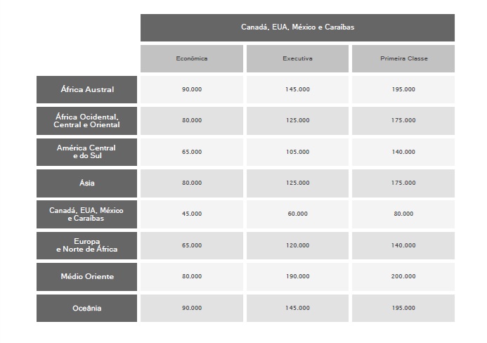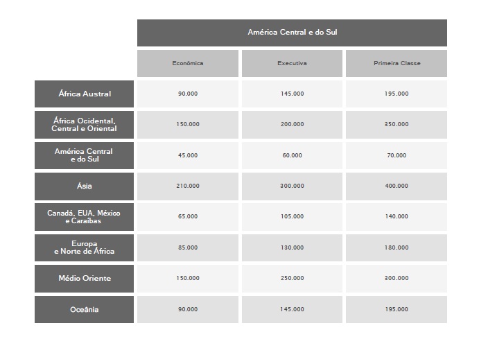 Os valores divulgados nesta tabela correspondem a valores de milhas para viagens só de ida