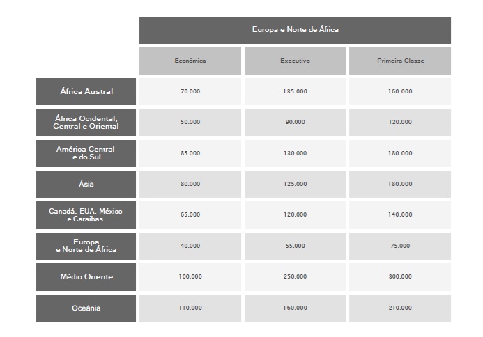 Brasil → Europa90.000 milhas150.000 milhas
