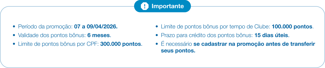 Transfira seus pontos até 09/04/2026.