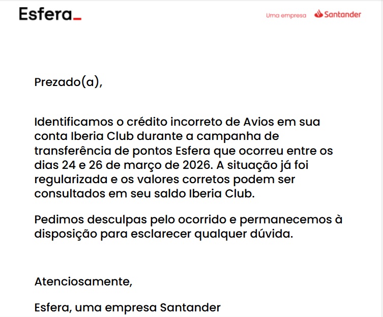 Este e-mail confirma um problema operacional que afetou muitos participantes da recente campanha de transferência entre Esfera e Iberia Plus (ocorrida entre 24 e 26 de março). O erro no crédito dos Avios é um ponto de atenção importante para quem participou dessa promoção visando a bonificação de até 20%.