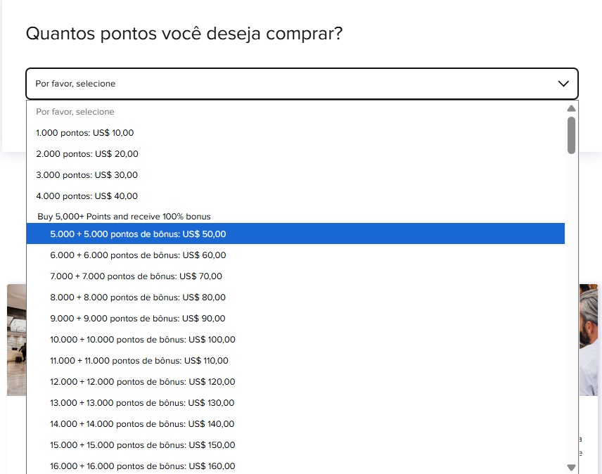 • Exemplo de Custo: Ao comprar 5.000 pontos por US$ 50,00, você recebe um total de 10.000 pontos (5.000 base + 5.000 bônus).