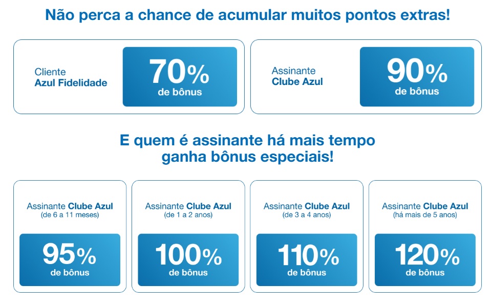 2. Para garantir o bônus, o cliente deve possuir cadastro no programa de fidelidade da Azul, com a conta em situação regular.