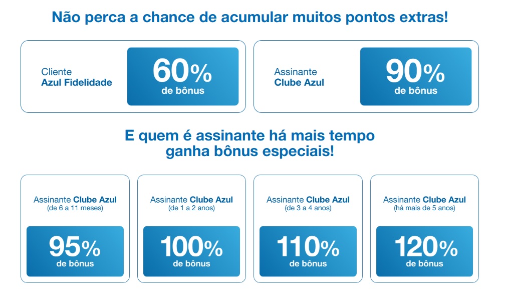 2. Para garantir o bônus, o cliente deve possuir cadastro no programa de fidelidade da Azul, com a conta em situação regular.