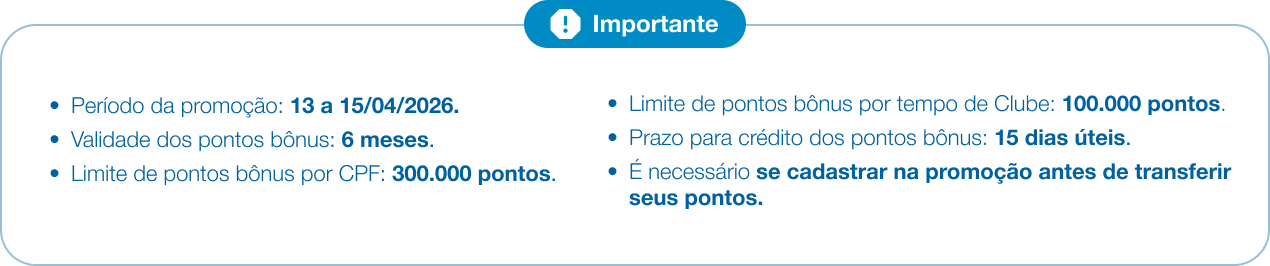 3.Clientes Azul: Bônus de 60% válido para clientes que transferirem pontos para o programa de fidelidade da Azul durante o período promocional. O limite máximo de pontos bônus a ser concedido por CPF é de 300.000 pontos.