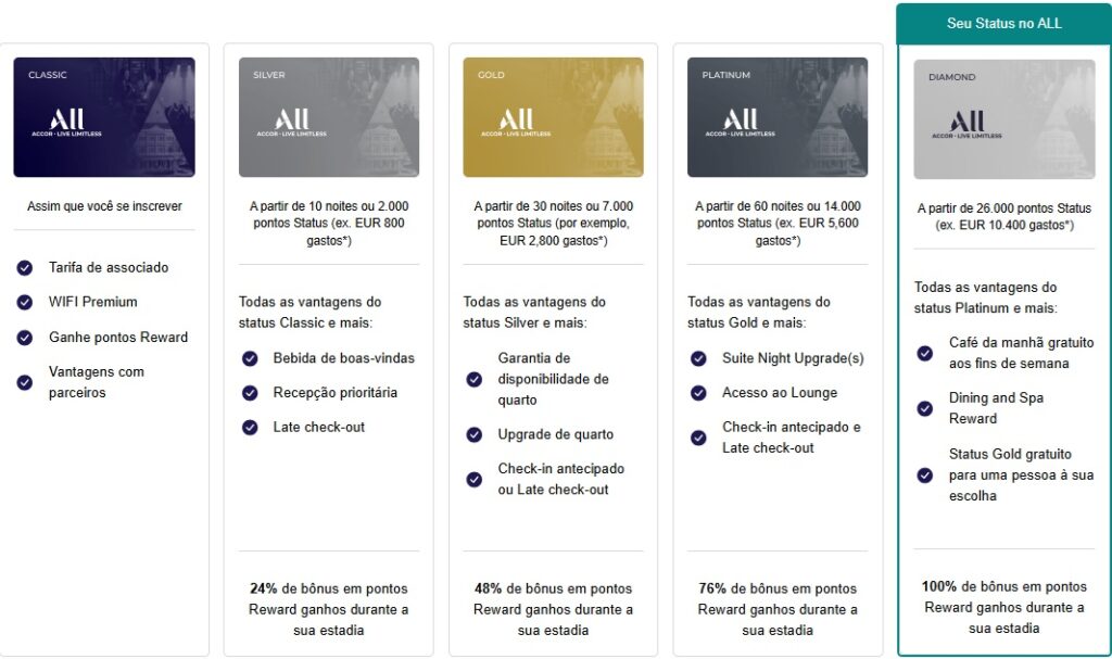 Os Pontos Status determinam sua categoria no programa de fidelidade ALL Accor e são obtidos por meio de hospedagens nos hotéis da rede Accor ou com créditos mensais vindos da assinatura do clube ALL Signature. J