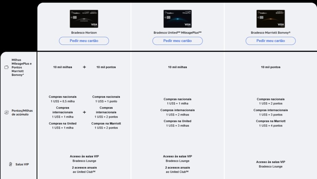 O Bradesco lançou uma linha inédita de cartões focada em dois dos maiores programas de fidelidade do mundo: United MileagePlus (companhia aérea) e Marriott Bonvoy (hotelaria). A grande novidade é o cartão Bradesco Horizon, que acumula em ambos os programas simultaneamente.