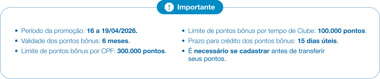 4. Clientes assinantes Clube Azul: Bônus de 90% válido para clientes assinantes do Clube Azul, com conta ativa, que transferirem pontos para o programa de fidelidade da Azul durante o período promocional. Para garantir o bônus de 90% o cliente deve realizar a adesão ao Clube Azul antes da transferência de pontos. O limite máximo de pontos bônus a ser concedido por CPF é de 300.000 pontos.
