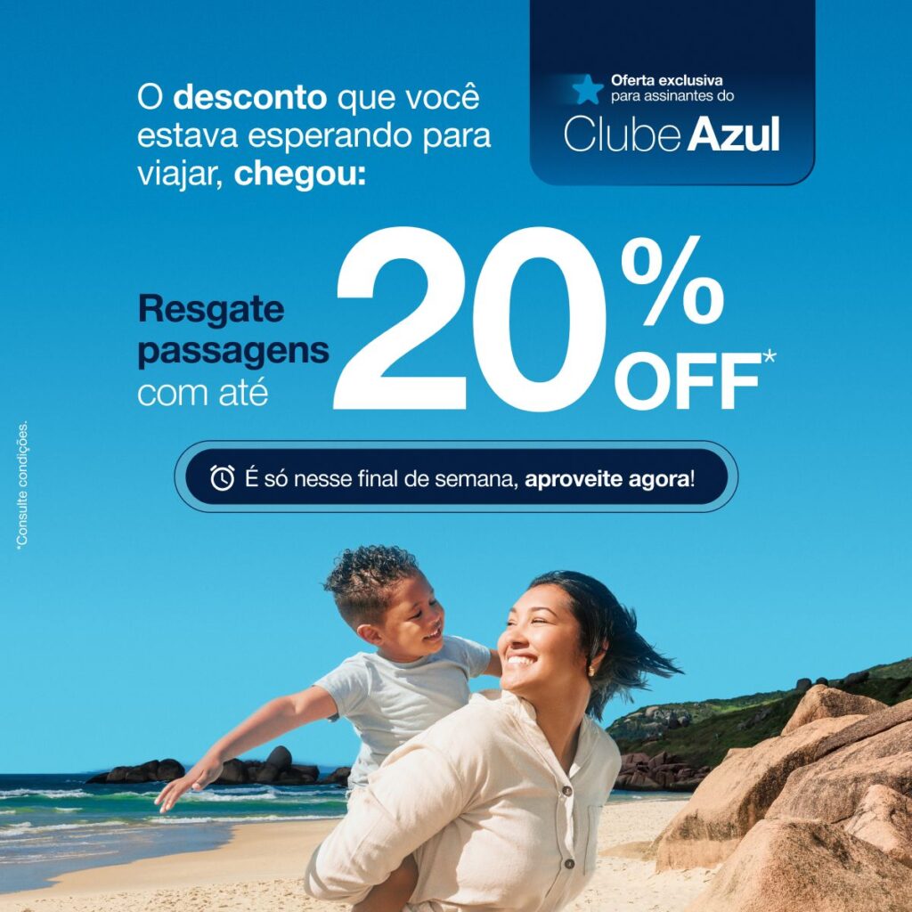 A promoção atual é uma oferta de resgate com desconto exclusiva para assinantes do Clube Azul, válida para passagens domésticas operadas pela própria Azul.