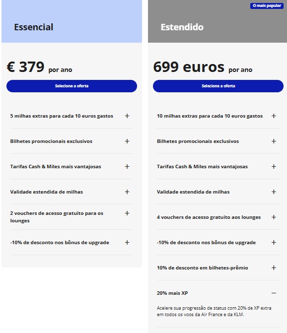 Para o seu perfil de viagens internacionais e planejamento para Madrid, o plano Estendido destaca-se pelo bônus de 20% de XP. Se você realizar trechos transatlânticos ou internos na Europa com a Air France/KLM, esse acelerador pode ser o diferencial para atingir o status Flying Blue Gold, que garante acesso ilimitado a lounges da SkyTeam e despacho de bagagem gratuita em todos os voos parceiros.