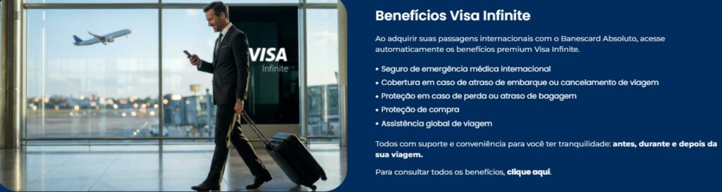 - Seguros de Viagem: Seguro para cancelamento de viagem, atraso de bagagem, perda de conexão e proteção de compra.